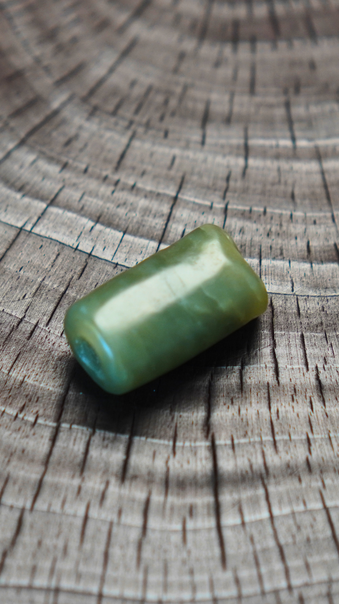 此管最具特色之处在于其自然古朴的使用痕迹。器物两端的边缘并非规整的平切,而是呈现出圆滑、不规则的过渡,孔口亦有因长期穿系佩戴而形成的自然磨损。更为难得的是,其孔道(应为对穿孔)内部亦可见清晰的包浆,这充分说明了它历经的悠久岁月与被珍视的历史。