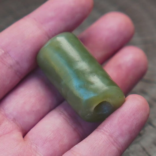 此件玉管(或勒子),选材极为考究,乃优质墨绿色河磨玉。其尺寸(长37毫米,直径19毫米,重23.6克)适中,握感扎实。器表通体素面无纹,尽显玉质本身朴素而深沉的美感。