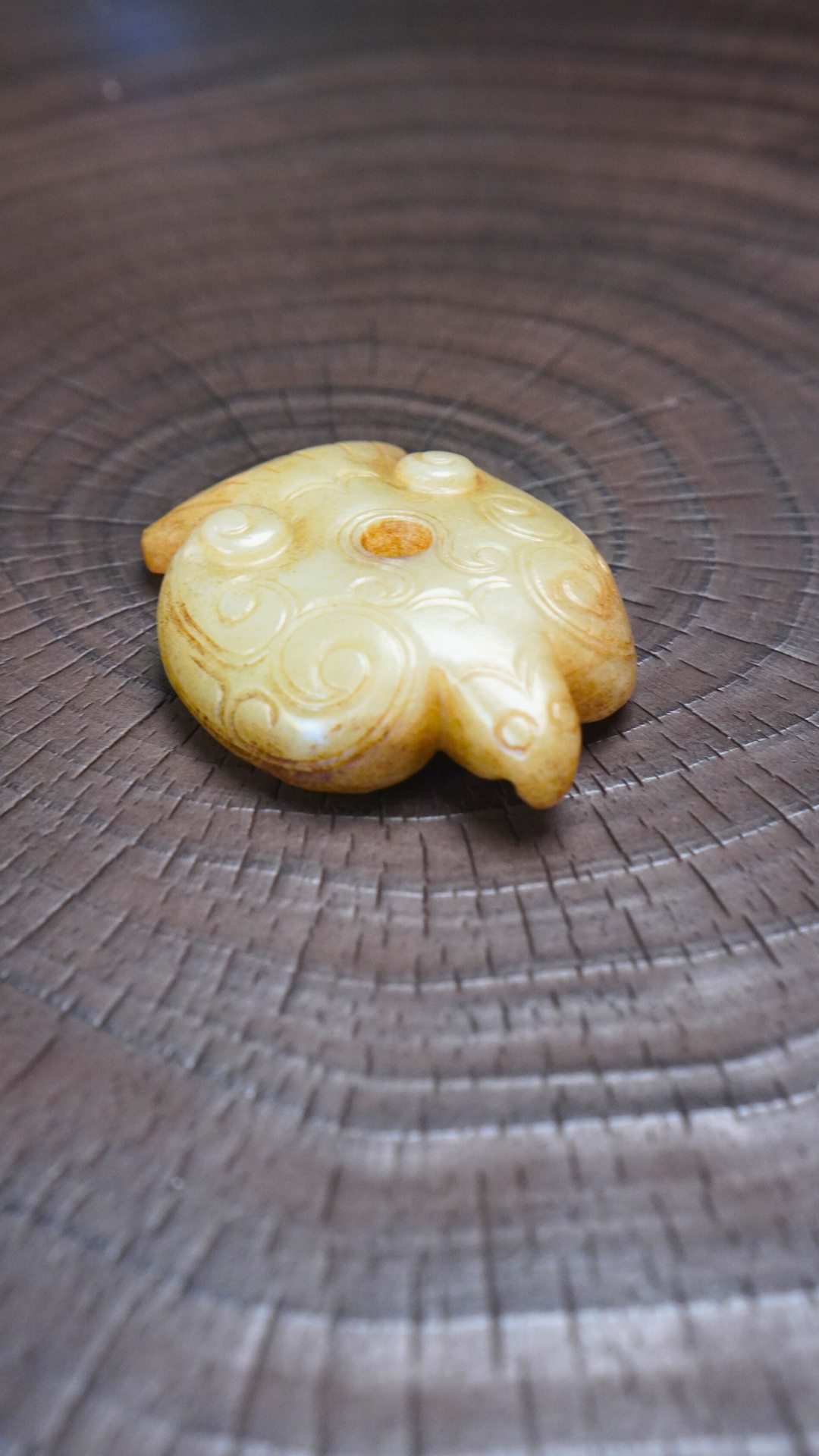 玉质与沁色: 此佩玉质温润,包浆极为丰厚,呈现出您所说的“油润”光泽,宝光内蕴。玉料底色应为白玉或青白玉,因深埋久远及盘玩,通体已“熟化”为柔和的米黄色。在器物边缘、尾部及凹陷处,可见大面积的褐色、黄褐色沁,沁色过渡自然,深入肌理,形成了您所说的“老辣皮壳”,古韵盎然。