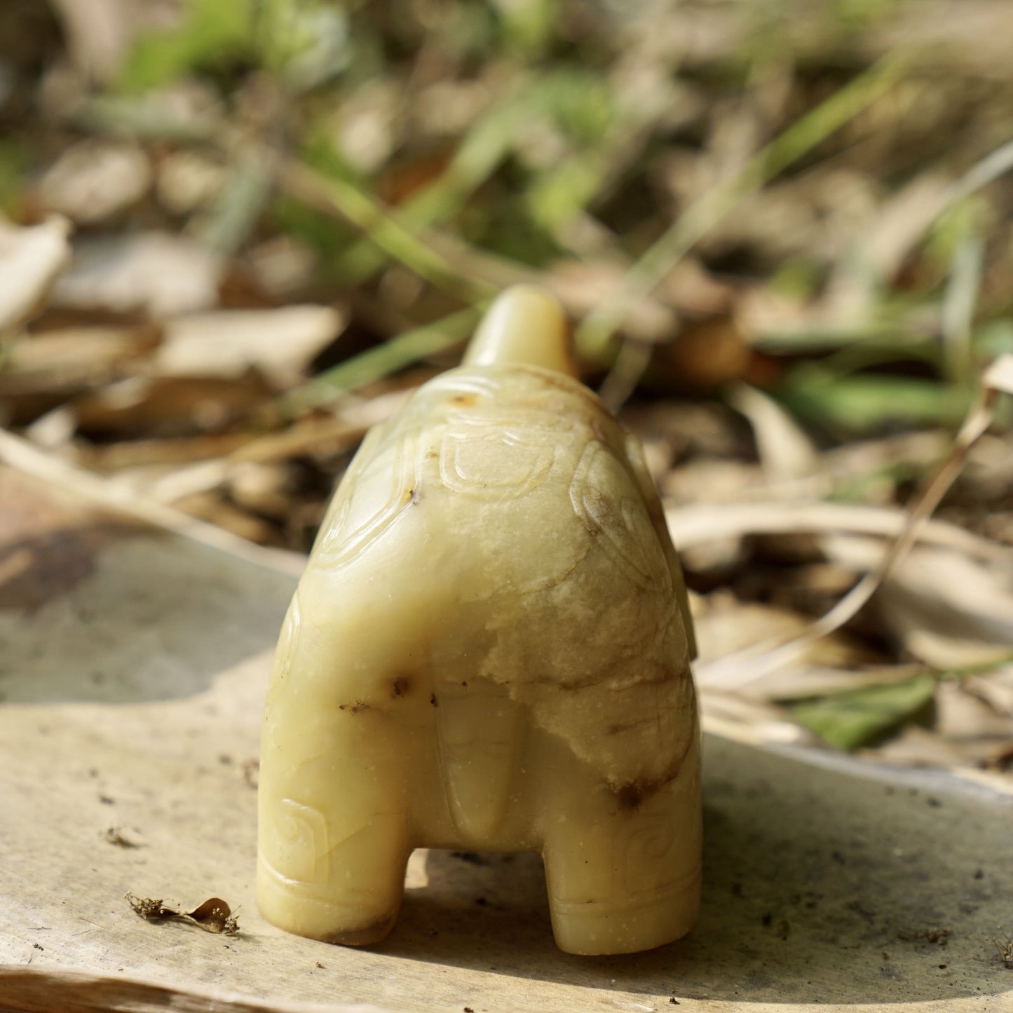 玉象呈浅黄色, 玉质熟润, 有部分玉质肌理变化, 表面分布有细饭渗, 右侧臀部轻微钙化, 有风化纹和土蚀痕迹.